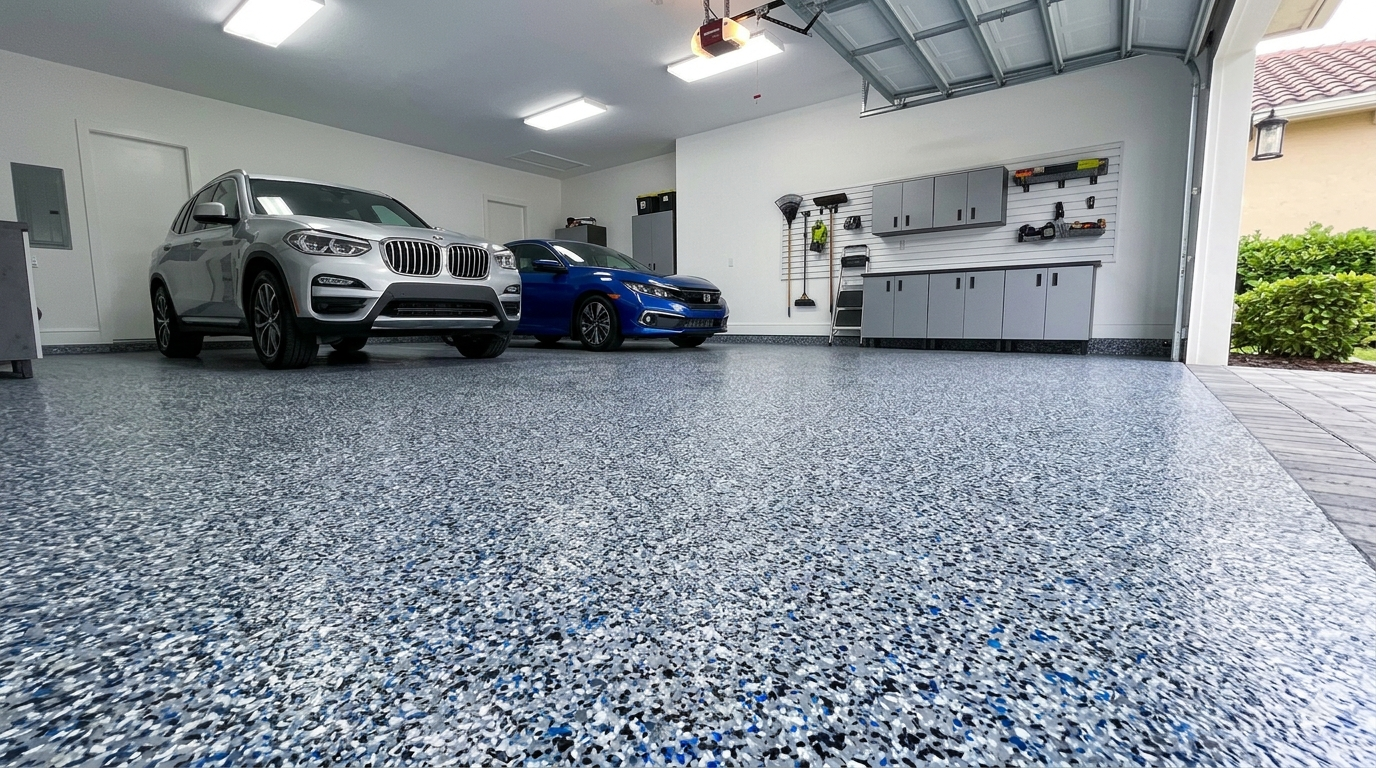 Installing a flake epoxy floor is a multi-step process that guarantees a beautiful and resilient finish. We start with thorough concrete preparation, often diamond grinding, to ensure the strongest possible bond. Next, a pigmented epoxy basecoat is applied. While this coat is still wet, we generously broadcast decorative vinyl flakes across the entire surface. Once cured, excess flakes are removed, and multiple layers of a clear, protective topcoat are applied. This seals in the flakes, creates a smooth yet textured finish, and provides superior durability, ensuring your floor is ready for anything.